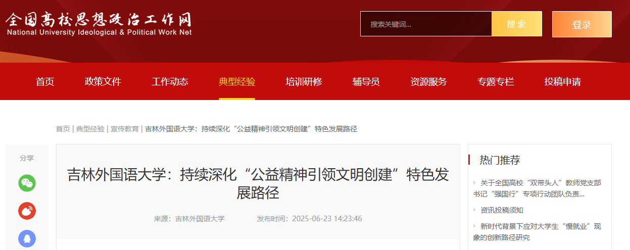 近日,全国高校思想政治工作网“典型经验-宣传教育”专栏刊发了《吉林外国语大学:持续深化“公益精神引领文明创建”特色发展路径》。