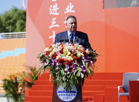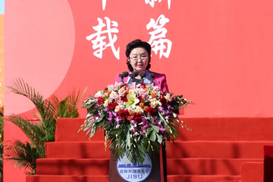 于洪君发表致辞。他指出,吉林外国语大学始终践行“学好外国语,做好中国人,讲好中国故事”的育人理念,不仅培养了大批具有国际视野的外语人才,更在民间外交、国际传播、跨文化交流等领域发挥了不可替代的作用,已成为中国高等教育的一张亮丽名片,更是中国与世界对话的重要桥梁。希望学校继续发挥语言优势,做国际传播的“生力军”,继续发挥多语种优势,培养更多“懂中国、知世界”的国际传播人才,用国际社会听得懂、易接受的方式,讲好中国共产党治国理政的故事、中国人民奋斗圆梦的故事、中国坚持和平发展合作共赢的故事;做文明互鉴的“先行者”,依托“地球村”等平台,推动不同文明平等对话,倡导包容互鉴的文明观,为构建人类命运共同体贡献中国智慧;做全球治理的“参与者”,进一步深化与国际组织的合作,培养更多具有国际视野、通晓国际规则的复合型人才,为中国参与全球治理提供人才支撑。