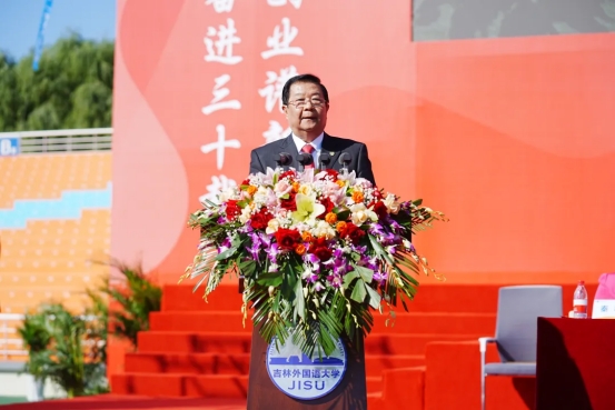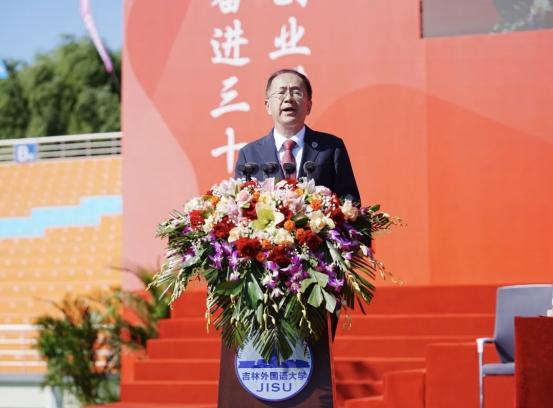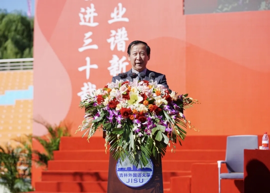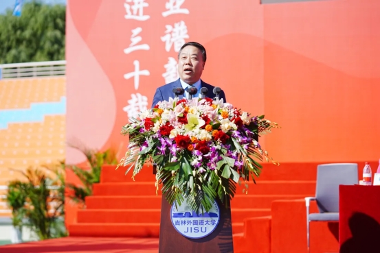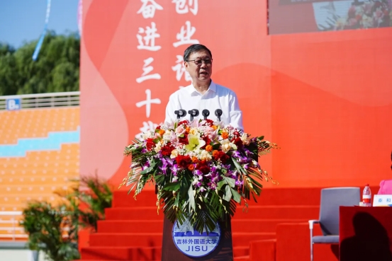 贾晓东发表致辞。他指出,吉林外国语大学是全国民办高校的榜样和标杆,也是吉林省地方高等教育发展的品牌和骄傲。希望学校站在建校30周年的新起点,继续发扬“敢为人先,追求卓越”的精神,奋力书写高质量发展的时代答卷。继续坚持立德树人的办学方向,更好地担负起教书育人的政治责任;坚持以追求卓越精神办好学校,持续为我省高等教育事业高质量发展贡献力量;坚持以脚踏实地的精神办好学校,加快建成国内领先、国际知名的高水平应用型外国语大学,为推进国家“一带一路”倡议、东北亚开发开放和吉林全面振兴率先实现新突破提供有力的人才和智力支撑。