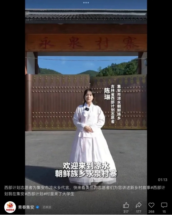 陈琳自2024年8月投身吉林省大学生志愿服务西部计划“卫国戍边”项目。服务期间,主要负责凉水朝鲜族民俗文化展示馆的讲解工作。为了能够更好地完成任务,她投入大量时间查阅文献资料,全面了解凉水乡的旅游发展战略以及丰富多彩的朝鲜族民俗文化。同时,她还参与当地宣传视频拍摄、乡政府党建工作,积极参与助农直播,利用业余时间帮助脱贫户销售农产品,用行动诠释出吉外学子“奉献、友爱、互助、进步”的志愿服务精神。