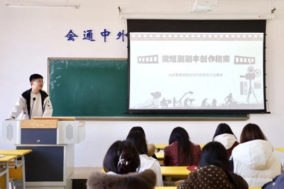 讲座中,杜宁介绍了国家对微短剧的相关政策和行业发展态势,着重阐释了吉林省对微短剧的创作要求和主题方向,为同学们进行微短剧创作提供了重要指导。周禹霖围绕微短剧剧本创作,从故事模型到台词写作,全方位解析了微短剧剧本的创作要点和写作经验。